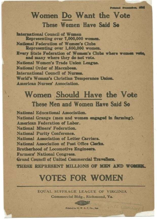 The Women’s Suffrage Movement also utilized broadsides to gain political and social support for Women’s rights to vote in the 20th century. The Equal Suffrage League of Virginia advocated for voting rights for women during the 1910’s and used broadsides to do so. Many of them believed that the right to vote was an essential aspect of citizenship to which women were entitled. They were part of more than 140 organizations within the state encompassing the membership of more than 20,000 people. Notably though, the league’s membership did not include black women, indigenous women, or other women of color.