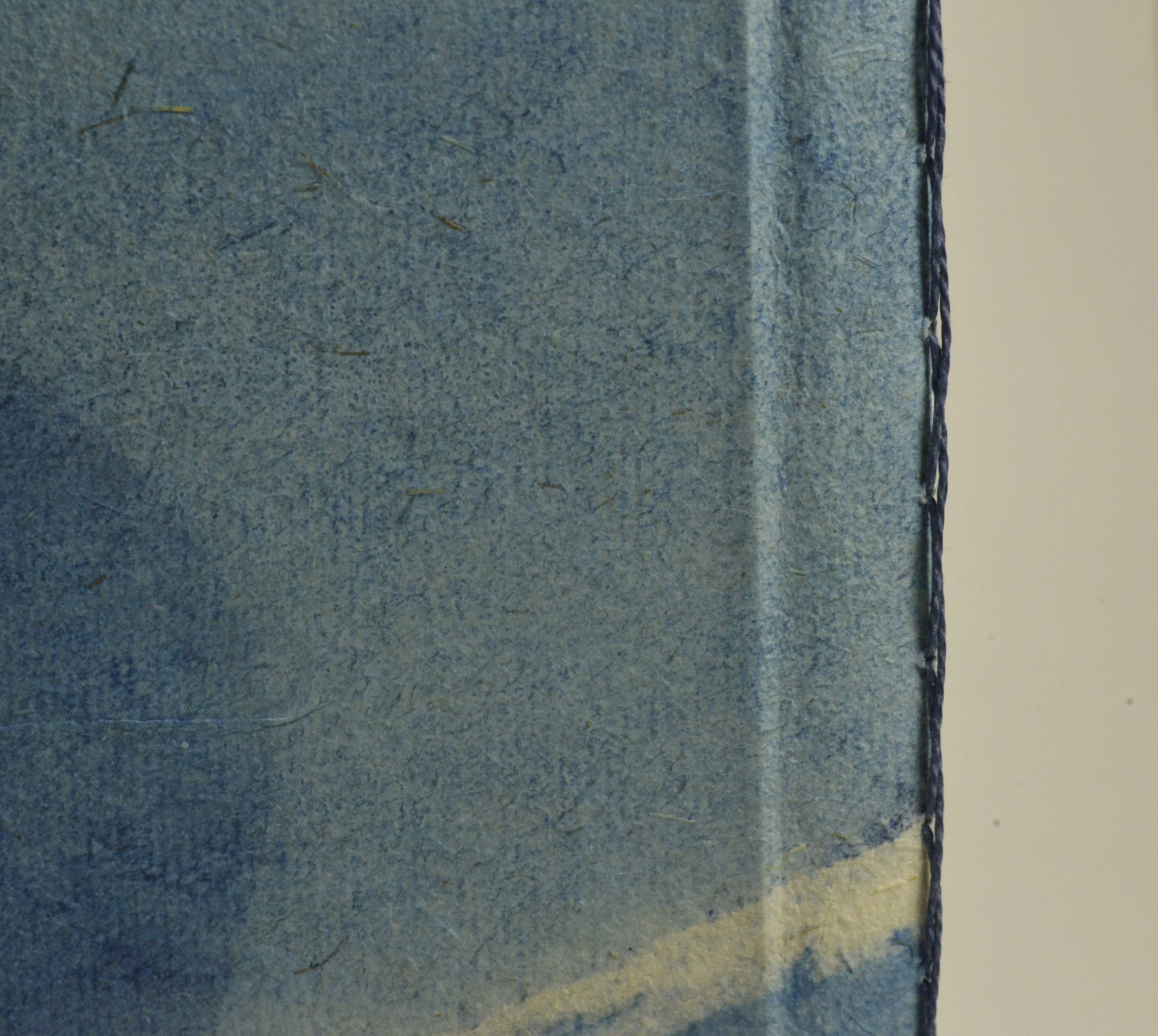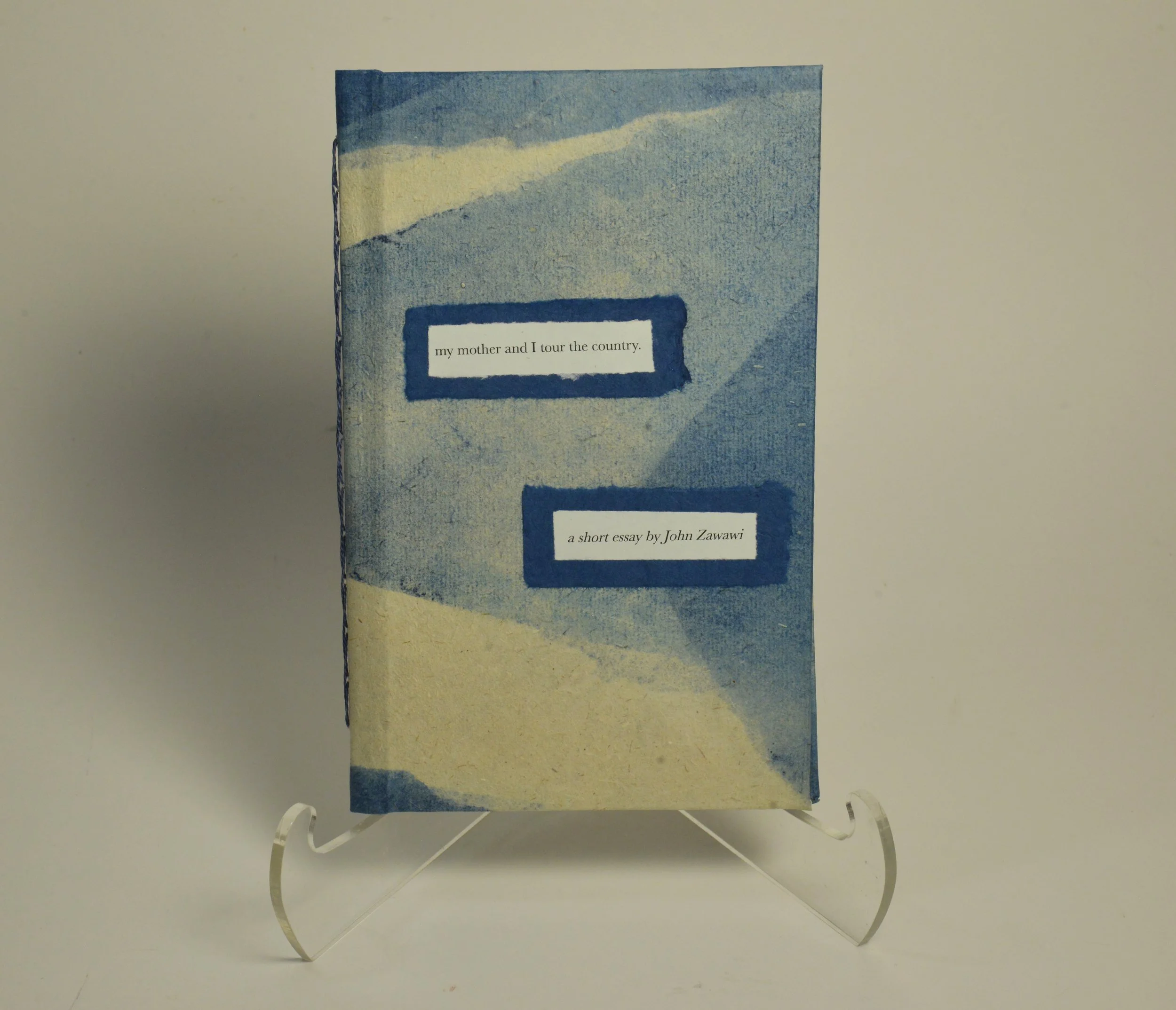 The second project by yet another MFA student at the University of Arizona is John Zawawi’s, “my mother and I tour the country”. This short essay is 16 pages long and was made in a very small edition of 2. The materials for this book evoke softness and grit, contemplation and immediacy, place and time. For this small book, the design parameters were much more open. John gave me a color palette and I came back to him with material suggestions and we worked from there. We ended up making a hard-cover book with a flexible spine and a visible sewing pattern. The covers are wrapped in Tucson’s own CAVE paper. This luxurious paper is handmade using belgian flax and hand-dyed using natural indigo. It was perfect for a cover that told a story and gave the illusion of the vastness of a 44hr road trip. The rich blue endpapers are an indigo Lotka paper from Hollanders dyed in the color “blueberry” and are fibrous yet smooth. Finally the sewing pattern that we chose is an adaptation of a saddle-stitch with decorative twists added using a silk embroidery thread (RIP Joann’s). The result is memorable and quiet with material truly framing the words of this essay with an unimposing confidence. The texture of the materials makes it feel like home.
